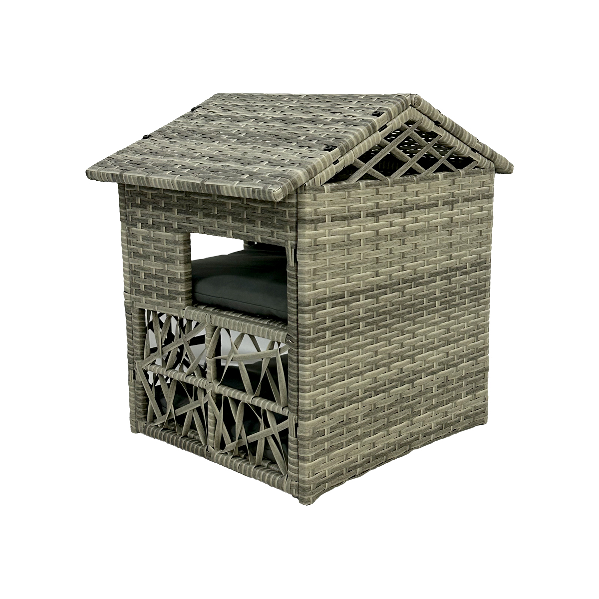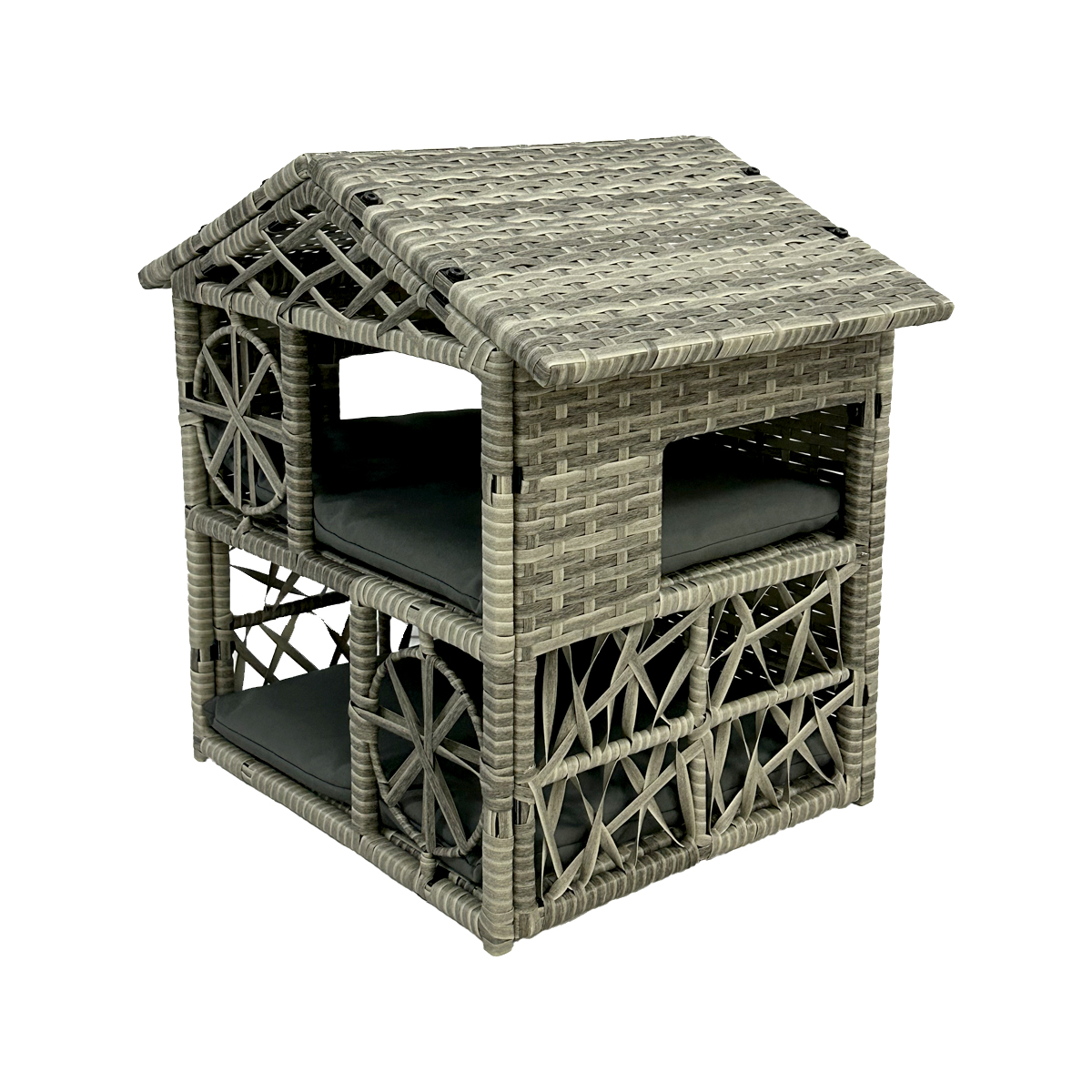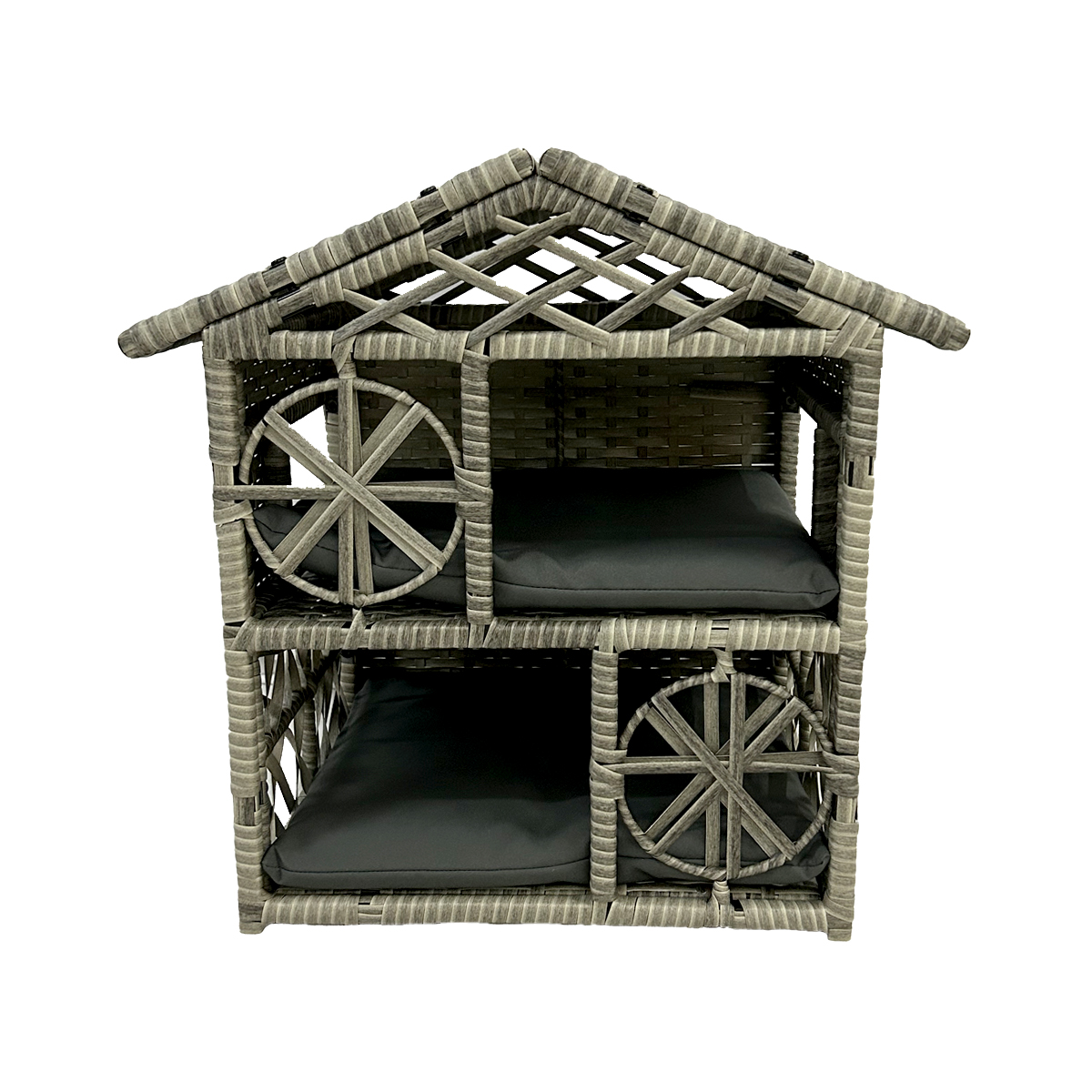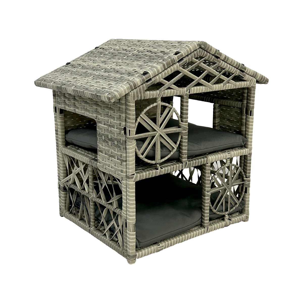 Ручно плетеная ротанговая лежанка и домик для кошки,Двухъярусный домик для домашних животных, вдохновленный лесом, привносит природу в ваш дом! Плетеная текстура с эффектом ротанга воссоздает очарование леса, а двухъярусная конструкция с вентилируемыми окнами в крыше дарит вашему пушистому другу собственное укромное место. Мягкая обивка обеспечивает комфорт кошкам и собакам, а открытая крыша и перфорированная конструкция гарантируют вентиляцию и доступ солнечного света. Благодаря винтажному дизайну и состаренной отделке, домик станет стильным акцентом в вашем доме. Порадуйте своего пушистого друга этим роскошным сюрпризом!