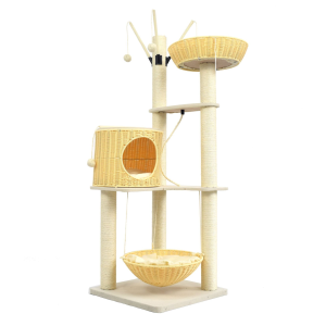 Это вертикальное королевство вашей кошки: плетеная ротанговая кровать предлагает уютное укромное место, верхняя смотровая площадка удовлетворяет их желание осматривать свою территорию, подвесная корзина служит качелями, а сизалевая когтеточка позволяет им точить когти в свое удовольствие. В комплекте с мячом для кошек для мгновенной интерактивной игры. Изготовленная из натурального ротанга для обеспечения воздухопроницаемости и экологичности, ее прочная основа исключает колебания. Она удовлетворяет инстинкты вашей кошки к лазанию, отдыху и играм, одновременно защищая вашу мебель от «атак кошачьих когтей».